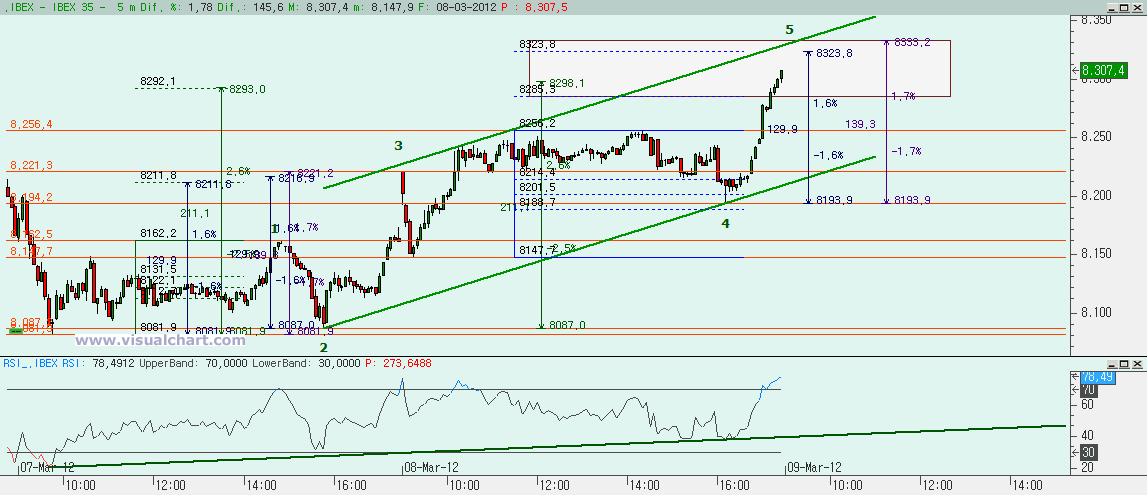 Sin embargo hay otra opción y es que acabara la caída en fallo (pero no el mostrado por Edu), sino fallo ayer por la tarde. Entonces desde ahí deberíamos contar un recuento y podríamos haber hecho una A ó 1 a mediodía, luego una pequeña caída para ser una B ó 2 (solo corrige el 38,2%) y la subida final una C ó 3. El primer objetivo estaría en el 8.363 si fuera una C para ser igual a la A. Pero el objetivo más normal estaría en el 8.468 para ser igual al 162% de la A ó 1. Entonces el canal alcista debería romperse y hacer uno acelerado.