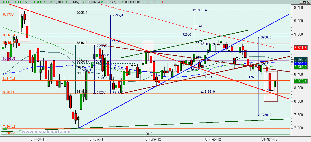 Si miramos el gráfico desde máximos de febrero, vemos como hemos rebotado en la parte baja del canal bajista y justo en el punto en el que teníamos una posible C igual al 162% de la A. ¿O tal vez ha sido una 3? El que tengamos tan buena canalización y que la 2 llegara al 80% de la 1 parece indicar que lo que hemos tenido ha sido una ABC, pero no podemos asegurarlo mientras el rebote no supere el mínimo de la 1 (que además vemos que casi coincide con el 50% de la posible 3). Entonces, el objetivo ahora es ver si superamos la zona del 8.379-8.482. Una 4 debería pararse en esa zona y hacer un nuevo mínimo. Si la superamos (y especialmente si superamos los 8.482) querrá decir que confirmamos una ABC bajista, lo que daría un sesgo alcista a la situación ya que no habría sido el comienzo de un tramo bajista. Como mucho habría sido el primer tramo de una corrección bajista, si no ha sido la corrección completa.