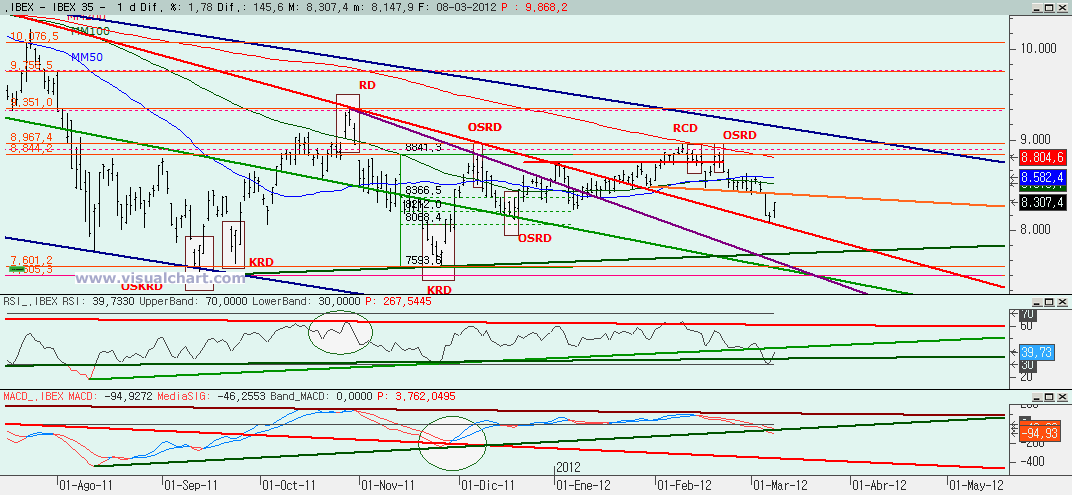 Jueves 08 de Marzo de 2012: Jornada de rebote en el Ibex tal y como anticipamos anoche y que ahora nos deja en la situación de definir cuál de los escenarios propuestos puede ser el correcto. Recordemos, primer escenario con posible ABC bajista terminada, con lo que el rebote debe ser mayor o segundo escenario con 3 de 5 bajistas hechas y ahora este rebote ser la 4. Vayamos con los gráficos.