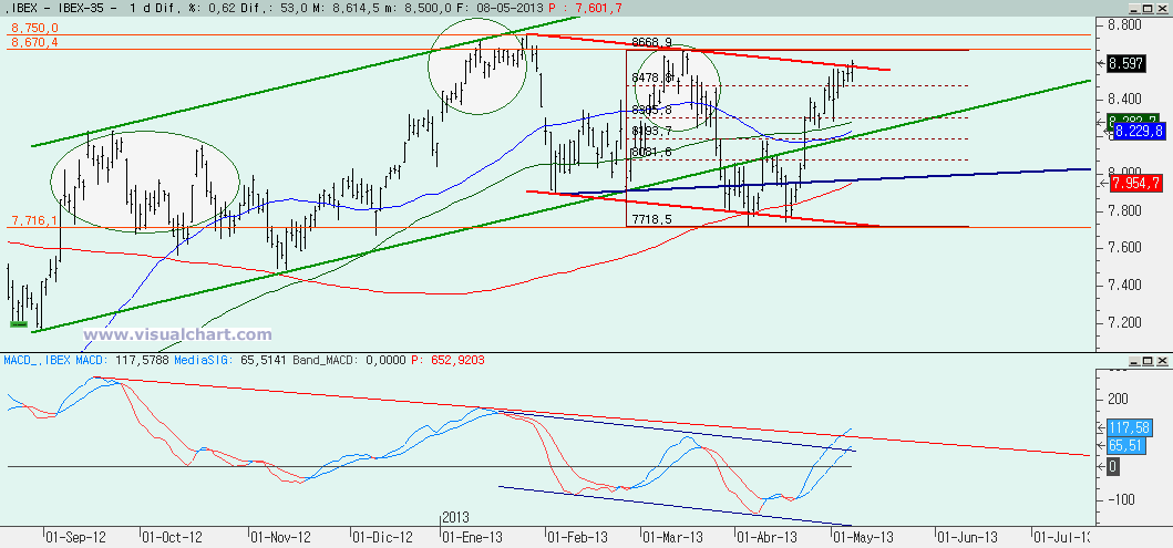 Gráfico diario: cierre ligeramente por encima de la parte baja del canal bajista. Esto no es suficiente para considerarlo roto, y si no, no tenemos más que ver lo que pasó en la parte baja del mismo. Pero es significativo, que ni siquiera hagamos amago de caer algo en esta zona de resistencia. Si se rompe este canal bajista, iremos a por los máximos anuales, y tal vez algo más. Pero vamos a fijarnos sobre todo en el MACD, que está algo por encima de la bajista, pero que está suavizando su subida. Atención a cuando llegue a su máximo y se gire a la baja. Será el momento de cerrar los largos, si es que lo estamos. Mientras tanto, a esperar que se rompa el canal o no.