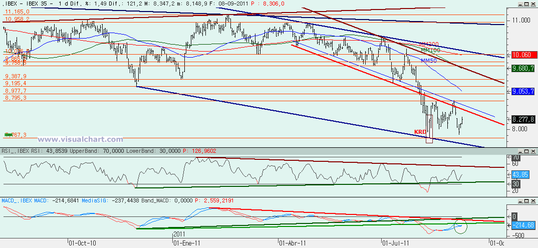 Si miramos el gráfico diario vemos que el rebote ha comenzado antes de hacer un nuevo mínimo y si nos fijamos, el MACD que parecía girarse a la baja ha hecho un requiebro y parece querer irse arriba de nuevo a intentar romper esa alcista que nos frenó hace unos días. El RSI también se va arriba y parece querer ir también a por la bajista. Ahora de lo que se trata de ver es si el precio va a ir de nuevo a por la parte baja del canal e incluso a por la bajista donde nos giramos, si se va a meter dentro o si no va a poder superar los máximos de finales de agosto y comienzos de septiembre.