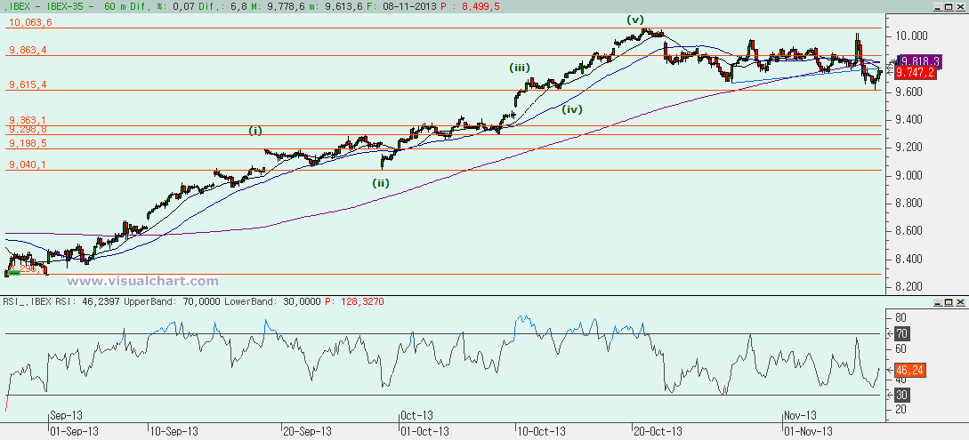 Gráfico desde máximos de octubre: hemos venido diciendo que la corrección desde ese máximo parece una plana con una A inicial, luego una B que llega a entre el 80 y el 100% como marcan los cánones y luego una C abajo. Hemos dicho que la C debería ir a entre el 9.533 y el 9.668, zona que ya hemos alcanzado el viernes. Una C igual a la A nos daba un 9.629, más o menos el mínimo del viernes. Lo único que no acaba de encajar para pensar en que ha acabado la C es el espacio temporal, ya que lo mínimo sería que la C durara hasta el martes. De momento la subida se ha parado en la alcista verde que fue la 0-b de la B, con lo que hay que ver si esto es solo un pull-back. Para confirmar que ha terminado la C hay que romper la bajista roja 0-B y muy deprisa, entre el lunes y el martes. Si eso no ocurre, si mañana lo que hacemos es ir hacia abajo y perder mínimos, entonces habrá que pensar que solo hemos hecho la i y la ii de la C (la ii habría acabado en el máximo del viernes), de modo que la posible i habría sido la extendida (por lo poco que retrocede la ii). La ii habría sido un ABC con b fuerte y ahora debería llegar una iii que si fuera igual al 61,8% de la i nos daría un 9.546. Después vendría una iv y luego una v abajo. Y todo encajaría con que acabara la C por lo menos el martes y dentro del rango marcado. Pero entonces el RD no sería bueno. Todo lo veremos el lunes, porque si seguimos subiendo habría que pensar que el RD es bueno y si bajamos y perdemos el mínimo del viernes entonces habrá que ir a por el final de la C. También hay que decir que si la C fuera igual al 162% de la A nos daría un 9.383.