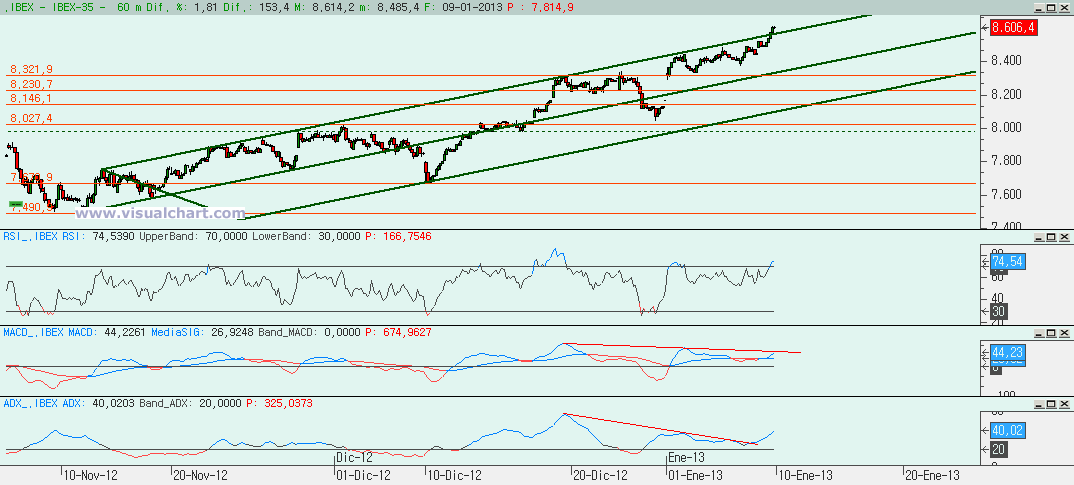 Vayamos ahora con los recuentos. Teníamos la duda, en su momento, de si la corrección desde máximos de septiembre había sido en ABCDE o simplemente en ABC. Si fue en ABCDE, la E terminó en el mínimo de diciembre. Si fue una ABC, entonces terminó en el mínimo de noviembre. Y los recuentos dependen de cuándo comenzara este tramo alcista. Tenemos los dos posibles recuentos en azul si fue una ABCDE y en verde si fue una ABC. En el caso azul habríamos hecho la 1 y la 2 y estaríamos ahora en la 3 cuyo objetivo alcista estaría en el 8.699 si fuera igual a la 1 y en el 9.100 si fuera igual al 162% de la 1. Tenemos en azul un posible canal alcista acelerado que será el que debamos vigilar. No se debe perder ya si queremos que estemos en una 3, pero claro, para eso hay que romper por arriba el canal alcista verde para continuar con el acelerado. En e caso verde habríamos hecho ya la 1 y la 2 en corrección continua y ahora la 3. Una 3 igual a la 1 nos daba el 8.576, pero como hoy ya hemos estado por encima habría que pensar en el 8.912 para ser igual al 162% de la 1.