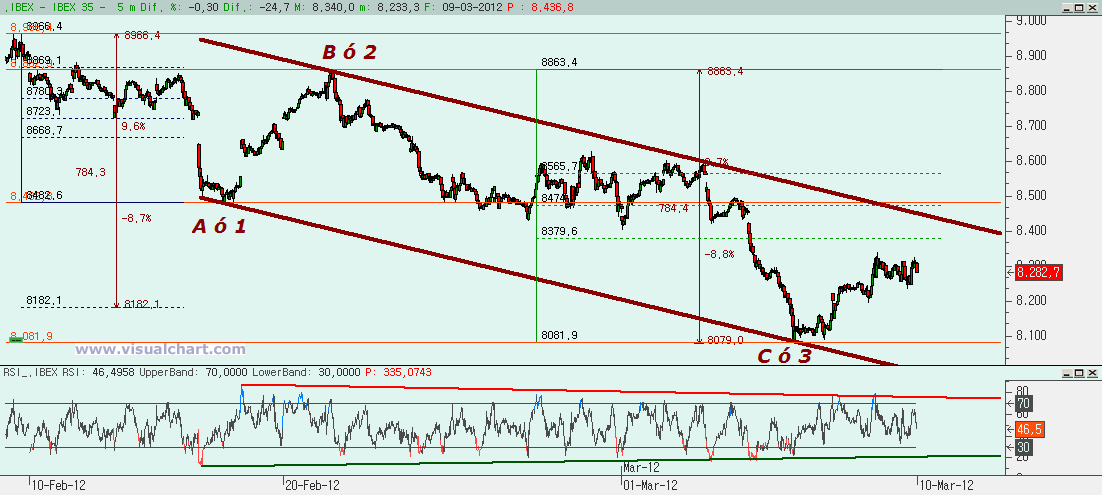 Ese gráfico desde máximos de febrero nos muestra una caída formando un canal bajista en lo que podría haber sido una ABC o bien solo 3 de 5 bajistas, con la C ó 3 igual al 162% de la A ó 1. Entonces ahora deberíamos comprobar si estamos haciendo una 4 y nos quedaría entonces una 5 abajo o bien si hemos terminado una ABC bajista. Pues bien, una 4 no debería ir más arriba de la zona del 8.379-8.482, no pudiendo superar bajo ningún concepto esos 8.482. Si superamos esa zona es que o todo ha sido una ABC o que estamos haciendo 5 bajistas pero es una pauta terminal y sería todo muy alcista. Por tanto, vamos a fijarnos muy bien en la forma que puede tener esta posible 4 para ver si realmente lo puede ser o no y en esas cotas.