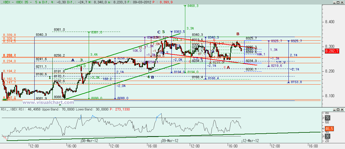 Si miramos el recuento desde mínimos de la semana pasada tenemos dos opciones, la primera con 5 alcistas hasta el máximo de inicio de sesión y la segunda con una ABC con la C aproximadamente igual a la A. Entonces, desde ese máximo hicimos un canal bajista (posible bandera) también en ABC con la c igual a la a. La subida posterior se quedó entre el 80 y el 100% de esa caída, lo que parece indicarnos que pudo ser una B, por lo que quedaría una C bajista. Lo normal en estos casos es que la C se quede entre el 100 y el 138% de la B, por lo que la C podría quedarse entre el 8.200 y el 8.234, estando además el 8.219 en medio que es el que haría la C igual a la A y el 8.211 que es el 50% de la subida. Si perdemos esta zona, tenemos el 8.153 como cota que haría una C igual al 162% de la A. Pero esto cambiaría si superamos el máximo del viernes. Y entonces habría que pensar en que aún estamos en la B o que la corrección ha sido tan pequeña y en forma de bandera porque la C alcista (azul) no habría sido tal, sino solo la i de la C, y el objetivo alcista podría estar en la zona del 8.468.
