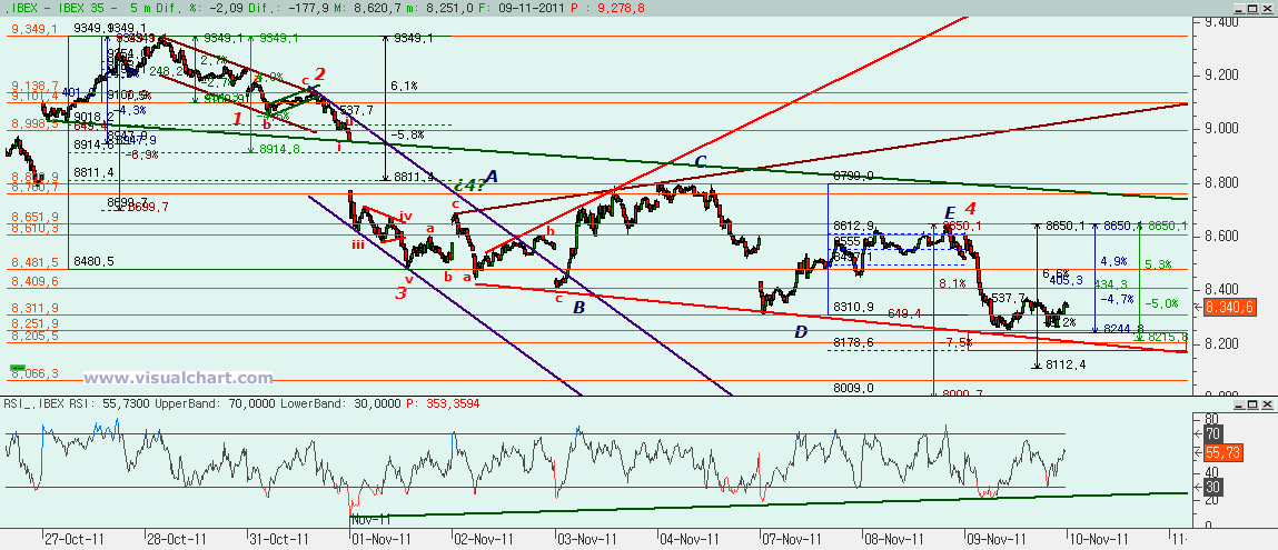El recuento desde máximos de finales de octubre se ha clarificado algo. Habíamos señalado varios posibles escenarios, pero el haber hecho un nuevo mínimo bajo el de comienzos de noviembre ya anula alguno de ellos. Concretamente el que no decía que habíamos hecho 5 bajistas el mínimo del día 7. Pero habíamos señalado que una de las opciones era la de haber estado haciendo un triángulo expansivo que podría ser la 4 y que ese expansivo podría ser la 4. Tras hacer la A, B, C y D, la E podría no ir a la parte alta del mismo, sino quedarse antes y pensamos que la E terminó en el máximo de ayer. Desde ahí debería haber comenzado la 5 y es el momento de calcular el objetivo para la misma. Y el objetivo inicial debería estar entre el 8.178 y el 8.244 para que la 5 estuviera entre el retroceso del 127% de la 4, entre la cota que haría la 5 igual al 162% de la 1 y la que haría la 5 igual al 50% del conjunto 1-3. Si se perdiera esta zona, entonces habría que pensar en ir a la zona del 8.000 – 8.010, aunque tenemos una cota en el 8.112 por el medio que no sabemos si deberíamos incluirla en el rango inferior o en el superior. Y es que nos haría un rango demasiado amplio en cualquiera de los dos casos.