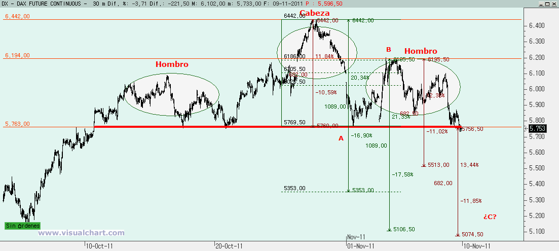 Por tanto, mañana deberíamos caer más, por debajo de los mínimos de hoy para terminar la v de la 5 y desde ahí ya intentar un rebote más sólido. Pero ojo, porque necesitamos dejar una señal de giro en el gráfico diario para fiarnos. Si llegamos a las cotas señaladas y no dejamos al cierre una señal de giro en el gráfico diario, nos mosquearemos bastante. Y es que tenemos algunas señales muy peligrosas. Y si no, no tenemos más que ver el gráfico del DAX con una inquietante figura de HCH que de romper la clavicular con claridad nos anunciaría más bajadas. Porque nos diría que el primer tramo bajista habría sido una A ó 1, el rebote hasta el 61,8% la B ó 2 y quedaría la C, que debería llevarnos, en primera instancia al 5.513 para hacer una C ó 3 igual a la A ó 1, pero si la C ó 3 fuera igual al 162% de la A ó 1 tendríamos objetivo en el 5.100, casi en la proyección bajista del HCH que estaría en los 5.075. O sea, que ojo si perdemos los mínimos de hoy y, con ello, la clavicular del HCH.