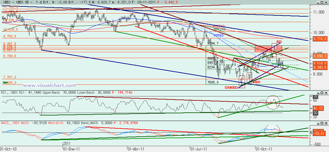 Miércoles 09 de Noviembre de 2011: Nueva jornada bajista en el Ibex para continuar con los retrocesos iniciados a finales del mes pasado. Anoche no teníamos claro el escenario posible, por lo que señalamos varias posibilidades y una de ellas, la opción roja se ha cumplido a la perfección. La duda ahora es ver si con la caída de hoy ha sido suficiente o si debemos seguir cayendo. Vamos a ver los gráficos para ver si podemos descubrirlo.