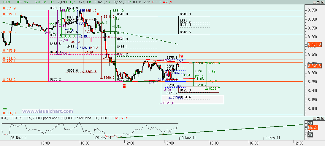 Si hacemos un zoom en lo que sería la 5, nos damos cuenta de que hoy habríamos hecho la iii aproximadamente igual al 262% de la i y desde mínimos del día habríamos estado haciendo la iv que podría haber terminado al final de la sesión formando una especie de triángulo. Entonces, desde el cierre deberíamos ver el objetivo para la v. Y el primer objetivo estaría entre los 8.192 y los 8.226. En ese rango estaría la cota que haría la v igual a la i, igual al 38,2% del conjunto i-iii, retroceso del 127% de la iv y retroceso del 424% de la ii. Si se pierde esa zona, siguiente objetivo entre los 8.128 y los 8.177, para hacer la v igual al 162% de la i, igual al 50% del conjunto i-iii, igual al 61,8% del conjunto i-iii, retroceso del 162% de la iv y retroceso del 462% de la ii. Lo único que no nos acaba de gustar es que no haya divergencias alcistas desde la (iii) de la iii, aunque puede ser que al tratarse del recuento interno de una 5 deberíamos tomar un gráfico de menor duración en lugar del de 5 minutos.