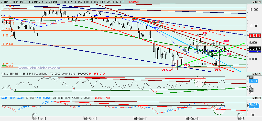 Si miramos el gráfico diario nos damos cuenta que la caída originada por el ORD de esta semana ha llegado al 38,2% de la subida previa, lo que es lo mínimo exigible. Al llegar a ese nivel rebotamos con fuerza, formando otra figura de giro, ahora alcista, un RD. Pero, ¿esto quiere decir que el ORD queda anulado y el que prevalece es el RD? Parece que la caída no ha sido lo suficientemente grande para lo que nos tienen acostumbradas estas figuras, pero la verdad es que han sido más de 400 puntos en dos días. El caso es que debemos ver los recuentos para ver cuál de las dos señales es la correcta. Pero, como sabemos, el stop para el ORD debe estar en los máximos de la semana (para los cortos) y el stop del RD debe estar en el mínimo del viernes (para los largos). La última señal es la de RD y es la que deberemos tener más en cuenta, pero solo si se ha producido en un objetivo bajista. El MACD sigue cortado al alza y parece que buscando la bajista. EL RSI vuelve a irse arriba y parece volver a irse a por la bajista