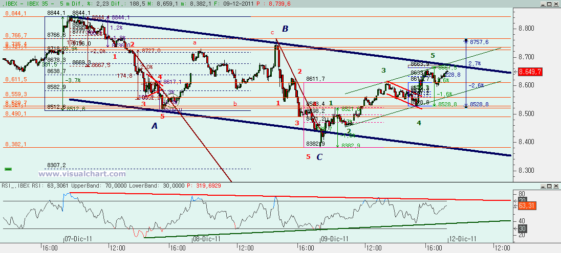 Domingo 11 de Diciembre de 2011: Jornada de fuerte rebote el viernes en el Ibex. Tras la corrección de los dos días anteriores abrimos con gap bajista y formando un nuevo mínimo para luego ir remontando y acabar con fuertes ganancias. El mínimo de inicio de sesión encajó a la perfección con nuestro primer escenario, puesto que habíamos dicho que podríamos estar haciendo una corrección en ABC con la C en 5 ondas y como la 3 había sido menor que la 1, el máximo para la 5 estaría en el tamaño de la 3. Y el mínimo justo se quedó a escasos puntos de ese objetivo. Por tanto, tuvimos una gran oportunidad de poder abrir largos con un stop realmente ajustado. Además, el rebote iniciado entonces pareció formarse en 5 ondas y cuando acabó la posible 3 corregimos hasta apenas unos puntos del máximo de la 1, lo que volvió a dar otra opción de largos con otro stop realmente ajustado. Hay pocas veces que se nos den dos oportunidades tan claras y con stop tan cercano como el viernes, otra cosa es que las aprovecháramos o no. La pregunta ahora es si vamos a seguir subiendo o si todavía tenemos que corregir más y volver a caer. Para ello, nada mejor que volver a nuestros gráficos.