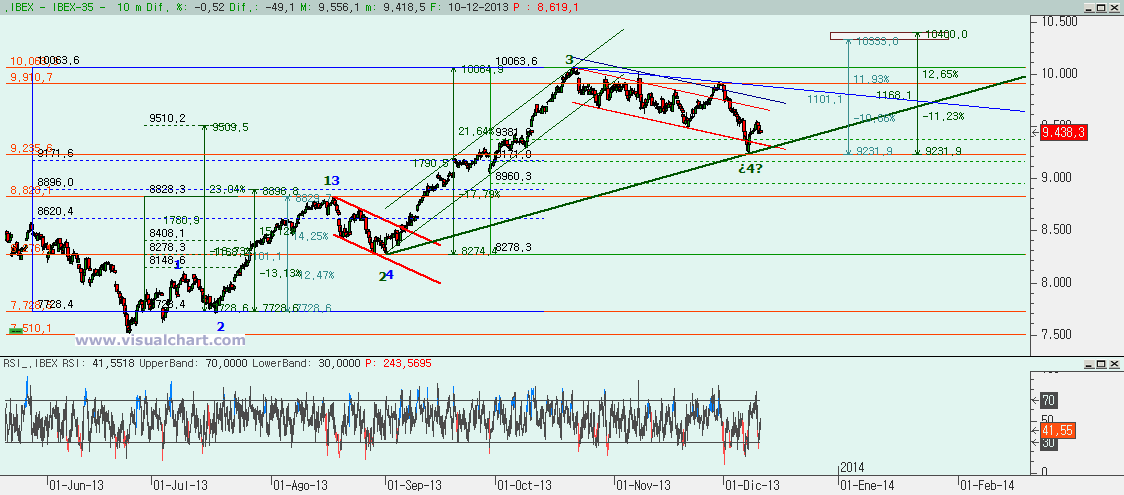 Gráfico desde máximos de finales de noviembre: dijimos que había dos opciones, una con 5 bajistas completas que parecía confirmarse con la rotura de la 2-4 en menos tiempo del que tardó la 5 en formarse y otra con 3 bajistas y este rebote ser la 4. Pero si fuera la 4, habría subido demasiado arriba, más allá del 50% de la 3 y del 38,2% del conjunto 1-3. Y eso podría abrir la opción de que la 5 acabara en fallo. Lo que está claro es que ahora mismo tenemos la duda de si en el máximo de hoy hemos acabado una 4 y la caída desde entonces ha sido la i de la 5 o si en el máximo de hoy ha acabado una i de la 5 alcista y ahora estamos en la ii. La caída hasta mínimos del día ha coincidido con el 38,2% de la subida y eso podría corresponderse con una a de la ii, con lo que mañana podríamos rebotar algo para hacer la b y luego una c bajista hasta el 50-61,8% de la subida, es decir, 9.357-9.395. Pero también tenemos una figura de HCH formada entre el lunes y el martes. Y eso significaría bajadas hasta zonas inferiores, lo que podría encajar con el recuento azul y quedar la 5 abajo. Por ello, debemos esperar a ver cuál de las dos opciones se define como la ganadora.
