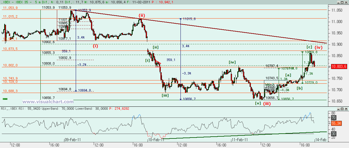 Pero podría hbaer otro recuento desde máximos. También serían 5 bajistas, pero habríamos hecho en los mínimos del viernes la (iii) en lugar de la (v). Una (iii) que habría sido igual al 262% de la (i) y desde ahí tendríamos el rebote para formar la (iv). Una (iv) que no podría superar nunca los 10.917. Este recuento parece avalarlo el RSI, con mínimos en la [iii] de la (iii) y desde ahí divergencias alcistas. El mínimo de la (v) lo veríamos por debajo de los mínimos de la (iii) y coincidiendo con el momento en el que se llegara a la alcista de ese RSI. Pero ya decimos que para ello no se debería superar la cota de los 10.917. Si se supera, entonces el escenario correcto será el primero.