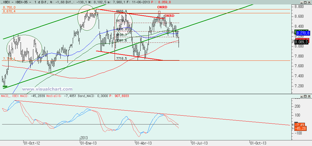 Jornada bajista en el Ibex en el día de hoy aunque suavizada por el rebote final. Sin embargo, la sensación es que aún queda algo más por abajo, ahora se trata de ver cuánto. Vayamos con los gráficos.