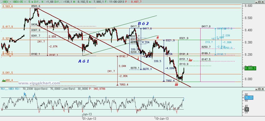 Gráfico desde el máximo de finales de mayo: parece que hicimos un primer tramo bajista que sería una A ó 1 (incluso una X) con una corrección posterior del 61,8% de esa caída y desde entonces un segundo tramo. Desde el mínimo de ese primer tramo si ponemos el 61,8% de ese tramo, tendríamos el 7.950 como objetivo. Y vemos que en ese segundo tramo podríamos estar haciendo 5 ondas, con el mínimo de hoy como la iii igual al 162% de la i. El rebote final sería una iv que no debería pasar del 8.110-8.151 para luego hacer una v abajo entre 167 y 219 puntos. Es interesante también ver como el mínimo de hoy ha estado en la continuación de la parte alta del canal bajista del primer tramo.