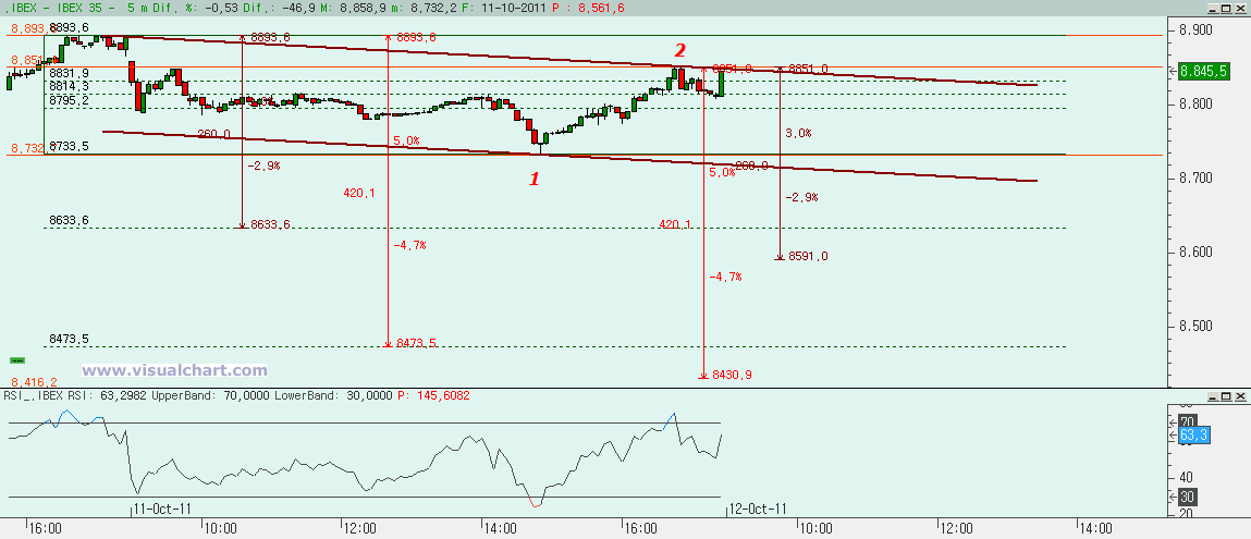 Martes 11 de Octubre de 2011: Primera jornada en el Ibex desde que comenzó el último rebote el martes pasado en que el Ibex cierra en rojo. Tras comienzo con gap bajista tuvimos una sesión bajista hasta que a las 3 de la tarde rebotamos con fuerza para irnos casi a máximos de la sesión al cierre. El gap bajista no ha sido cerrado, pero la caída no ha podido ir muy abajo. Las dudas que teníamos ayer siguen ahí, pero la rotura de los canales alcistas mostrados ayer nos hacen pensar que deberíamos seguir con la corrección. Sin embargo, tengamos cuidado si superamos los máximos de ayer. La situación no ha cambiado mucho desde ayer, pero veamos los gráficos para intentar comprender mejor la situación.