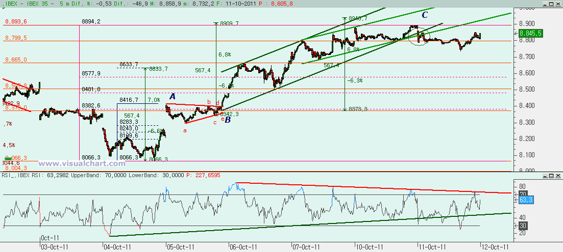 El gráfico desde mínimos de la semana pasada parece presentarnos una ABC con la C aproximadamente igual al 162% de la A en lo que sería la B que hemos puesto en el gráfico anterior. Las divergencias bajistas son muy acusadas y la rotura del canal alcista que se seguía en la C nos indica que ésta debe haber terminado. Podríamos pensar que en lugar de una ABC estuviéramos haciendo 5 alcistas y lo que hubiera terminado fuera la 3 y ahora venir la 4. Sin embargo, el que la posible alcista 0-2 se penetrara en la 3 nos hace pensar en una ABC y no en 5 alcistas.