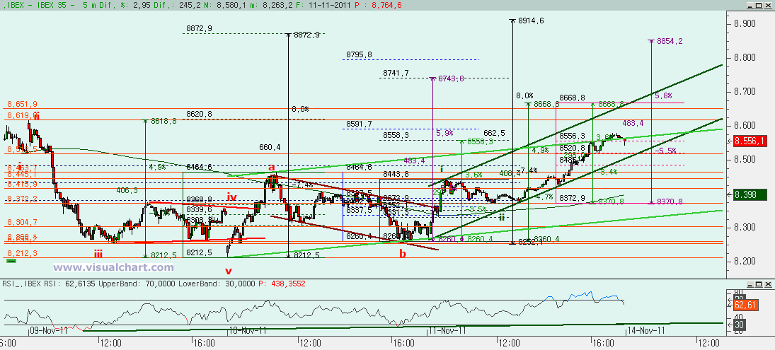 Y si hacemos un zoom desde el mínimo del jueves, vemos como hicimos una primera a (luego ya veremos si es una a o una 1), luego una caída para formar una b y después parece que estamos formando una c en 5 subondas. El viernes se frenó la subida en la parte alta del canal alcista formado desde que comenzó el rebote, pero lo normal es romperlo y seguir con el canal alcista acelerado que hemos puesto en verde oscuro. El caso es que habríamos hecho la i y la ii de la c y ahora estaríamos en la iii. El primer objetivo para la iii estaría en la zona del 8.670 para ser igual al 162% de la i. Hay que tener en cuenta que ese sería también el objetivo para una c igual al 162% de la a, con lo que ahí podríamos tener un parón para hacer una iv y luego la v arriba. Y si se cumple que el objetivo final es ese 8.670, entonces podría terminar la v con un doble techo. Pero si superamos esta zona, habría que pensar en ir más arriba. Si la iii supera esta zona, entonces podría irse hasta el 8.854 para que la iii fuera igual al 262% de la i. Entonces el objetivo final para la v podría estar en el 8.914 para que la c sea igual al 262% de la a. Pero si la iii se frena en el 8.670 y hacemos luego una iv que no vaya por debajo de la zona del 8.520-8.560, el objetivo final de la v podría estar en la zona del 8.795 para que la c llegue al retroceso del 262% de la b.
