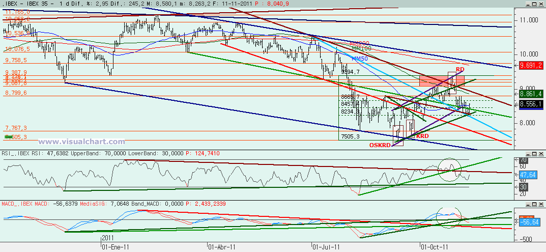 Domingo 13 de Noviembre de 2011: Jornada alcista el viernes en el Ibex para continuar con el rebote iniciado el jueves en el primero de nuestros objetivos bajistas. Tras un comienzo de sesión casi plano, las subidas se fueron adueñando del Ibex hasta terminar con una jornada claramente alcista. Y al cierre formamos una señal alcista clara que debería hacer que continuaran las subidas en las próximas sesiones. Veamos los gráficos.