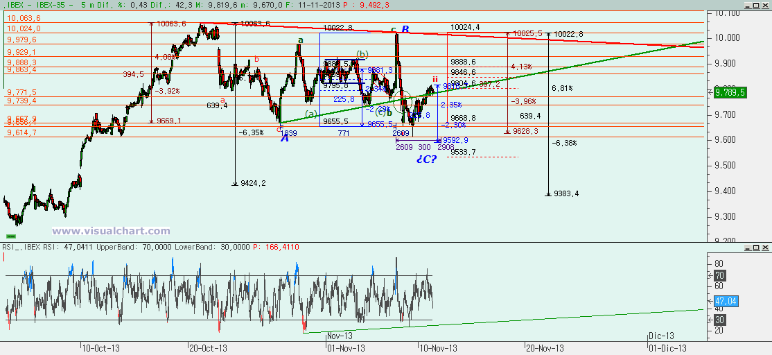 No vamos a repetir los gráficos desde mínimos de junio ni desde mínimos de finales de agosto porque están ya muy repetidos. Parece que esto que estamos haciendo desde el máximo de octubre es una 4 y como tal no debería corregir demasiado aparte de ser lo más diferente posible de la 2. Hemos venido apostando porque se trata de una plana, pero dijimos que lo suyo era que la C durara más tiempo. El RD del viernes parece indicar que sí que acabó ahí la plana, pero al no haber roto por arriba en menos tiempo del que tardó la C en formarse no podemos confirmar que haya acabado. Lo cual no quiere decir que no lo haya hecho. Podría ser que la plana hubiera acabado y vayamos a por máximos, que la plana haya acabado pero sea solo una A y hasta podría ser que no hubiera acabado en realidad, sino que sigamos en la C. En el primer caso debemos ir a romper por arriba la 0-B de la plana e ir a máximos. En el segundo caso no la romperemos la 0-B y estaremos laterales durante unas semanas, al menos hasta finales de noviembre o primeros de diciembre para hacer una B y luego una C abajo para finalizar la 4 si es que esto no es todo un triángulo en el que hayamos hecho la A solo. Y en la última opción, si la C no hubiera acabado habría que pensar en que no hay extensión de i en la C, pues la ii ya va más arriba del 38,2% de la i y tal vez haya que ir más arriba antes de hacer una iii abajo que pierda mínimos. Las tres opciones están abiertas y mañana intentaremos ver si tenemos más pistas.