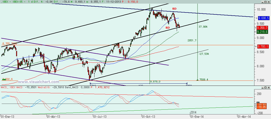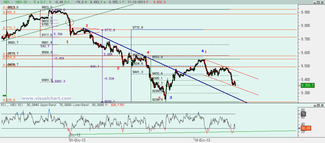 Gráfico desde máximos de fin de mes pasado: tenemos dos posibles recuentos, el rojo con 5 bajistas completas con el conjunto 3-5 igual al 262% de la 1 que haría que en el mínimo del viernes habría comenzado la 5 alcista del recuento del gráfico anterior. Eso significaría que en el máximo del martes habría acabado una i alcista y desde entonces estaríamos haciendo la ii. Como vemos, tenemos un canal bajista, que encajaría bastante bien con lo que sería una ii y más cuando hemos llegado al 61,8% de la posible i. Si esto realmente es una ii no deberíamos caer mucho más, la zona entre el 61,8 y el 80% sería lo máximo, es decir, la zona entre el 9.299 y el 9.357. Pero si seguimos bajando, entonces habría que pensar en que estamos en el recuento azul y esto sería la 5 bajista. Para ello habría que ver caída impulsiva y no sería nada descartable que la 5 acabara en fallo y no perdiéramos el mínimo del viernes. En cualquier caso, el mínimo del viernes no debería perderse y si se pierde entonces habría que empezar a pensar en que esta caída no es el final de la 4, sino el inicio de algo más.