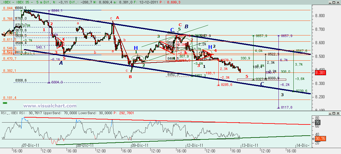Si miramos el recuento desde máximos de la semana pasada, vamos a cambiar un poco el recuento a ver si podemos tener algo más claro el escenario. Vamos a dar dos posibilidades, pero con un mismo recuento. Pensamos en que seguimos haciendo una ABC al tramo alcista pero hemos modificado el recuento. La A es la misma que habíamos señalado ayer, pero la B la hemos cambiado al máximo del viernes. Esa B habría sido una ABC también, y las 5 ondas alcistas del viernes habría sido la C de esa B en lugar del comienzo de un nuevo tramo alcista. Por tanto, la bajada de hoy habría sido la C con sus 5 subondas. Hemos marcado en rojo la primera opción, y es que hayamos hecho ya hasta la 4 y estemos ahora en la 5, que sería la extendida y que, si fuera igual al conjunto 1-3 nos daría una proyección bajista en el 8.334. Además, si la C fuera igual a la A tendríamos objetivo en el 8.327, con lo que ya tenemos una primera zona objetivo para la caída en esa zona del 8.330 más o menos. El máximo de la 4, que habría sido en triángulo, habría coincidido con el mínimo de la 1, pero sin solapar, lo que sería perfectamente posible. Sin embargo, el HCH que hemos señalado, que nos daría un objetivo bajista más abajo, en los 8.285 nos abre otra posibilidad. Y es que el recuento de la C fuera diferente. Lo hemos señalado en negro, y habríamos hecho hoy la 1 y la 2 y parte de la 3. El objetivo para la 3 podría estar en el 8.239 para hacer la 3 igual al 162% de la 1, y el objetivo final de la C podría estar en el 8.117 para hacerla igual al 162% de la A.