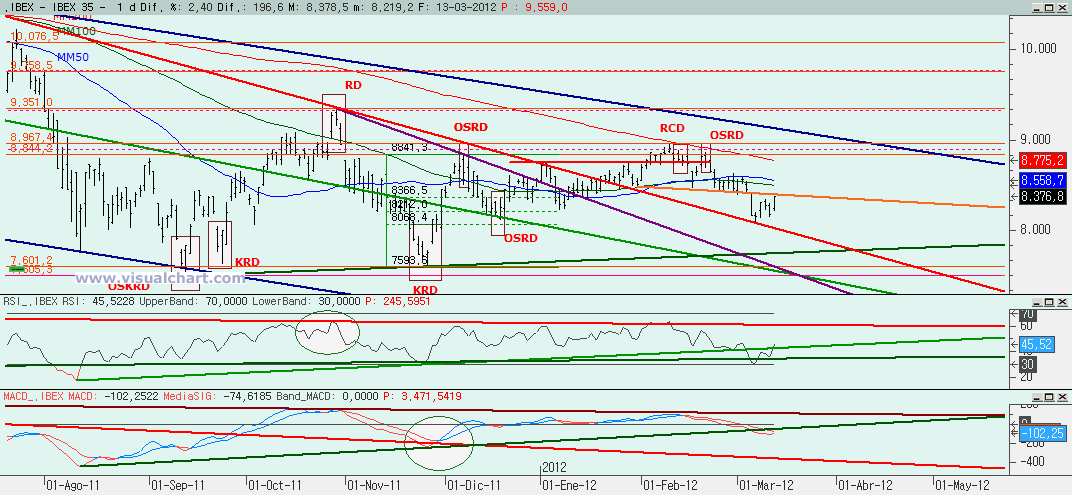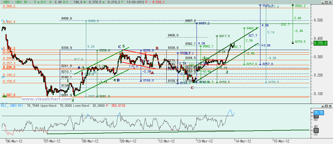El gráfico desde máximos de febrero nos mostraba un canal bajista y la posibilidad de estar haciendo 3 ó 5 bajistas. O bien una ABC con la C igual al 162% de la A o bien una 3 igual al 162% de la 1 y ahora estar haciendo la 4. ya hemos dicho que si esto fuera una 4 no deberíamos pasar de la zona del 8.379-8.482 y el 8.482 ser inviolable. El cierre de hoy, justo en la parte alta del canal bajista podría ser una buena zona para cortos, pero realmente lo interesante sería ver dónde acaba la 4 para hacer un canal bajista después. El canal actual no es tan importante y se puede romper al alza y seguir siendo una 4… Mientras no se supere el 8.482… Pero realmente, si superamos la parte alta del canal alcista iríamos demasiado arriba para pensar en una 5 sin fallo… Y esto empieza a hacernos pensar en que no estamos en una 4. Hoy además hemos superado la bajista del RSI, lo que suele ser anticipo de romper la bajista en precio…