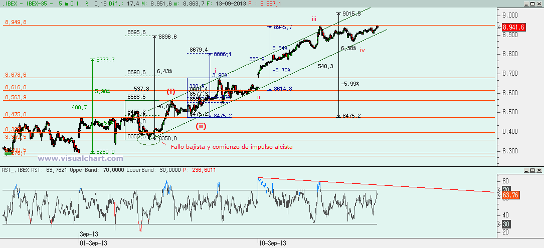 Gráfico desde mínimos de finales de agosto: parece que hicimos fallo bajista y que ahora estamos haciendo 5 alcistas. El canal alcista se sigue manteniendo firme y podríamos estar terminando la (iii), concretamente deberíamos estar en la v de esa (iii) habiendo terminado la iv en el mínimo del jueves. Si la (iii) fuera igual al 262% de la (i) tendríamos un objetivo en el 9.015 donde deberíamos empezar una (iv) antes de hacer la (v) que concluyera el impulso alcista. La (iv) no debería bajar de la zona del 8.750-8.810 si la (iii) termina por ese 9.015. Y cuando terminara ya podríamos trazar la (ii)-(iv) a vigilar por abajo para confirmar el fin del impulso alcista.