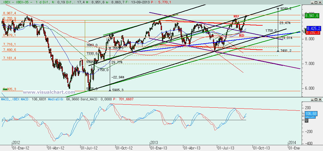 Gráfico diario: seguimos en la zona de máximos de dos años y en la parte central del tridente alcista, zona clara de resistencia, pero con el MACD aún con recorrido en busca de la bajista. Y en ese recorrido alcista vamos a señalar una cota que podría ser el objetivo, los 9.250. Y es que si nos marcamos como movimiento alcista el producido entre mínimos de julio del año pasado y el máximo de enero de este año, luego una corrección en el canal bajista morado con el throw-back ya hecho y ahora un nuevo impulso alcista desde mínimos de junio, el 9.250 es la cota que haría este tramo alcista igual al 61,8% de ese primero. Y sería una cota muy clara para que nos dejen con la duda de si esto es una C igual al 61,8% de la 1 o si es solo una i de una posible 3. Pero antes hay que romper la zona de resistencia.