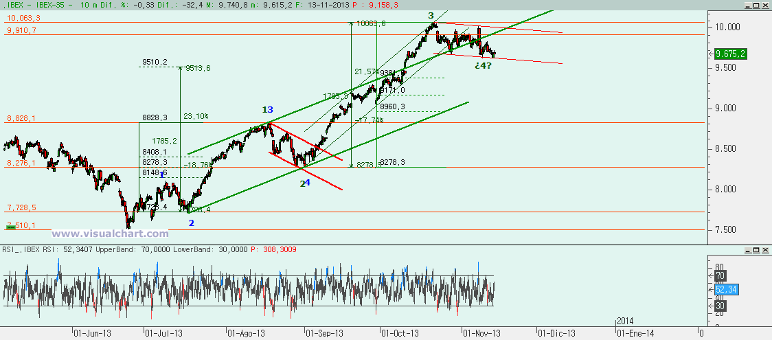 Gráfico desde máximos de octubre: hemos venido diciendo que parecía que habíamos estado haciendo una onda plana de libro, pero el que no hayamos ido hacia arriba a romper la 0-B de esa plana parece decirnos que esa plana no ha sido toda la caída. También pensamos en que la C de la plana no hubiera acabado, pero el que no hayamos perdido el mínimo del viernes nos dice que no estamos en la C. Y eso nos abre otra posibilidad que hemos venido marcando durante la sesión. Tras hacer la plana y terminarla en el mínimo del viernes en lo que podría ser una A, podríamos estar haciendo una B y habría que hacerla en ABC también. Desde el mínimo del viernes sería otra plana con el máximo de ayer la a, el mínimo de hoy la b que llega casi al 100% de la a y ahora tocar la c. Lo normal en una plana sería que la c llegara a entre el 9.823 y el 9.901, aunque veremos qué ocurre en el 9.745 que es lo mínimo a alcanzar ya que es la cota que haría la c igual al 61,8% de la a. Si realmente esto es una plana, cuando acabe será el momento de ver si esta plana es una (a) de la B tras la primera plana o qué. Pero lo que está claro es que seguimos correctivos.