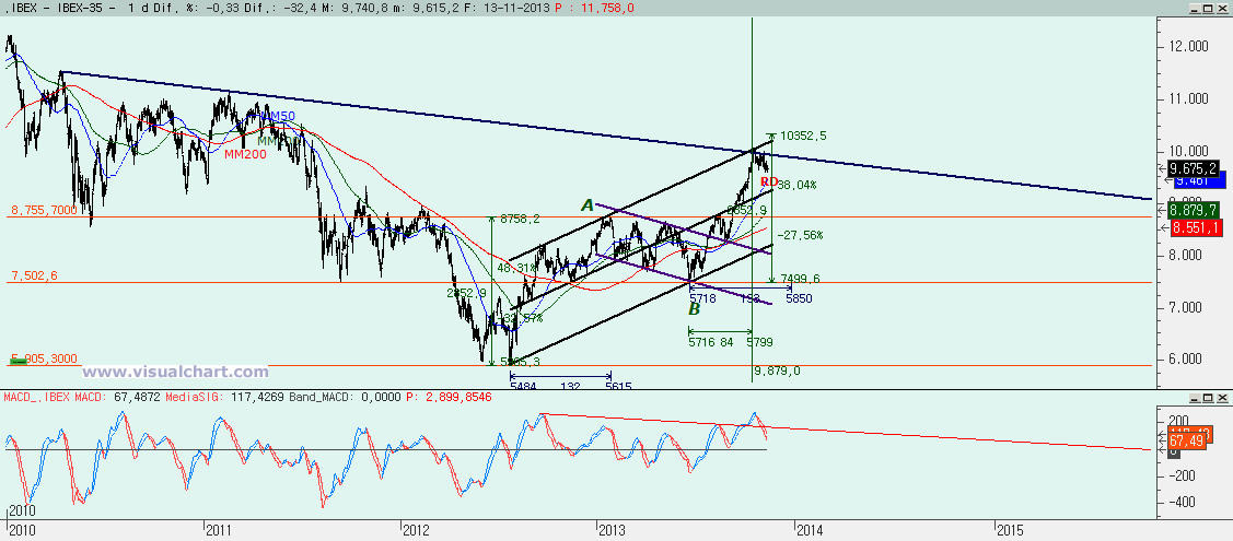 Gráfico diario: el RD del viernes ha aguantado por los pelos, pero habrá que seguir vigilándolo porque el siguiente ataque puede ser el definitivo para anularlo. El MACD sigue bajando mientras el precio se mantiene y se acerca la MM50 que debe servir de apoyo en breve. De fondo la parte central del tridente, que parece aún muy lejana, pero que debería ser el objetivo bajista final. Y por arriba la bajista desde 2010 es la que marca si vamos a llegar a ese 10.350 (o 10.560 si hay que contar la C desde el 17 de julio). Hay que romper para llegar ahí, aunque antes podría quedar más corrección.