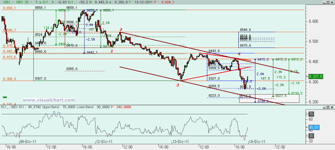 La siguiente opción es parecida a la primera, pero cambiando la 1 y la 2. El caso es que el primer mínimo del día habría sido la 3 y luego la 4 en triángulo. Entonces el objetivo bajista para la 5 podría estar entre el 8.199 y el 8.239. Allí tendríamos la cota que haría la 5 igual a la 1, igual al 50% del conjunto 1-3, igual al 61,8% del conjunto 1-3, el retroceso del 162% de la 4 y el retroceso del 424% de la 4. Además, hemos trazado la bajista 2-4 y la paralela por la 3. El final de la 5 podría estar en esa bajista por la 3, es decir, en la parte baja del canal marcado en grana. Entonces podríamos probar los largos en esa zona del 8.199 – 8.239 con stop ajustado, o los más cautos esperar a que se rompa la bajista 2-4.