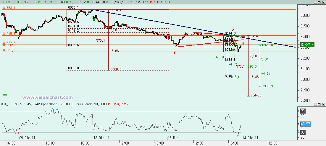 La segunda opción es la que nos dice que aún seguimos en la 3. Hoy habríamos hecho hasta la iv de esa 3 y el final de sesión sería la v de la 3 que tendría un objetivo en el 8.245 para hacer la 3 igual al 162% de la 1. Entonces allí deberíamos ver un rebote para formar la 4 que no debería subir por encima de los 8.360 – 8.400 para luego hacer una 5 bajista, con el objetivo seguramente en esa zona del 8.120 para hacer la C igual al 162% de la A. Este recuento encajaría con que el RSI no mostrara ninguna divergencia alcista dentro de la C.