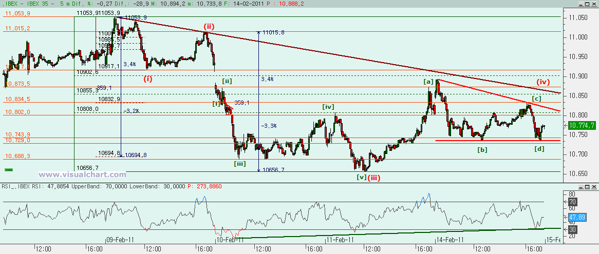 Lunes 14 de Febrero de 2011: Ayer en nuestro análisis de corto del Ibex desde máximos del día 9 señalábamos 3 escenarios posibles. El primero nos decía que habíamos formado 5 ondas bajistas desde máximos, con lo que ahora había que hacer una ABC alcista para corregir estas 5 bajistas antes de seguir bajando con otras 5. El segundo escenario nos decía que habíamos hecho 3 bajistas y que el rebote iniciado en mínimos del viernes era la 4 (o parte de ella) antes de hacer la 5 bajista. Después vendría una ABC igual que en el escenario 1. Y la última opción nos decía que lo que habíamos terminado en mínimos del viernes era una ABC bajista antes de comenzar otro tramo alcista. Para concluir dijimos que hoy deberíamos ver cuál de los escenarios era el correcto. Pues bien, increíblemente tenemos que decir que hoy no hemos aclarado nada y que cualquiera de los escenarios es aún factible. Veamos cómo es posible esto y cómo podremos mañana intentar descubrir cuál es el escenario correcto.