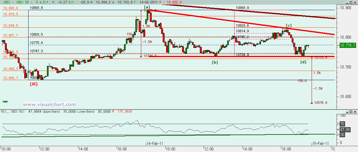 Escenario 2: Desde máximos del día 9 hemos formado 3 de 5 bajistas y ahora estaríamos formando la (iv). Esta (iv) no debería llegar nunca a los 10.917, mínimos de la (i), que ya hemos visto que hoy no los hemos alcanzado. Y desde los máximos de hoy podríamos estar formando un triángulo descendente. Si así fuera, podríamos haber hecho ya la [a], [b], [c] y [d] de este triángulo, con lo que sólo quedaría la [e], y ya sabemos que la [e] no tiene por qué coincidir con la parte alta del triángulo, sino que puede quedarse antes o algo después. Pero no debe superar los máximos de la [c], con lo que la superación de los 10.834 invalidaría este escenario de triángulo, aunque podríamos seguir dentro de la (iv) si en lugar de triángulo se forma de otra manera, por ejemplo en murciélago. Entonces la cota que de superarse invalidaría definitivamente el escenario son los 10.917. Si el escenario de triángulo fuera bueno y no superáramos los 10.834 y luego perdiéramos los mínimos de hoy, entonces deberíamos ir a formar la (v) y ya tendríamos una cota a vigilar para ver si el escenario es correcto. Sería el máximo de la [e]. Y es que si tras hacer un máximo en la [e] por debajo de los 10.834 perdemos los 10.733 hacer un nuevo mínimo por debajo del del viernes y luego superamos los máximos de la [e], entonces no podríamos estar haciendo la (v).