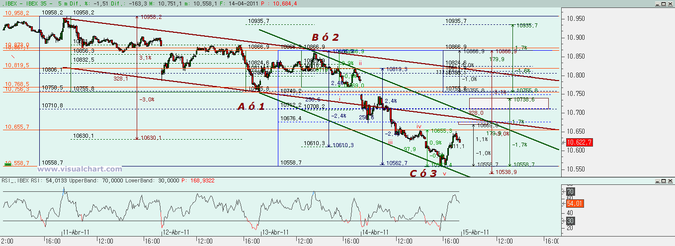 Jueves 14 de Abril de 2011: Jornada hoy de severas caídas en el Ibex y de severos errores a la hora de operar durante el día. Ayer presentábamos varios escenarios. El tercero lo descartamos ya de entrada y la idea era descubrir cuál de los otros dos era el correcto. Apostamos por el primero y pronto vimos que el primer objetivo bajista que señalamos ayer se rompía a la baja. Había que probar el segundo objetivo. Y también lo perdimos, con lo que el segundo escenario era el caballo ganador… O al menos eso creíamos, porque llegamos al 10.603 que era la cota marcada para terminar la C o la 3 desde máximos de hace unos días y tampoco rebotamos… Entonces había que poner en marcha la capacidad de reacción e improvisación antes unos escenarios que ya no cuadraban. Y volvimos al escenario de hace un par de días más bajista y que habíamos pensado ya no era el bueno. Y parece que sí que lo era. Veamos pues, de nuevo, este escenario y las posibilidades que tenemos para mañana. Recordemos que mañana es tercer viernes de mes y ya sabemos lo que sucede entonces… Vencimientos…
