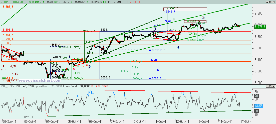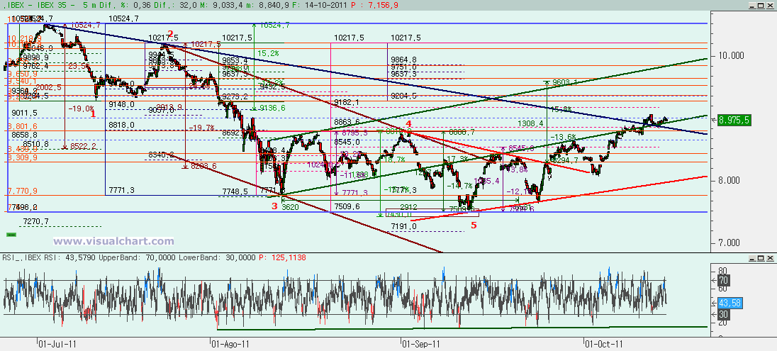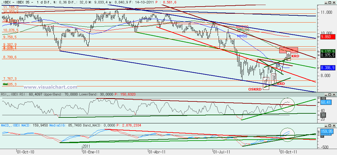 Domingo 16 de Octubre de 2011: El Ibex volvió a subir de nuevo, aunque sin superar los máximos del jueves. Recordemos que el jueves señalamos que había quedado una señal de KRD en el gráfico diario que podría ser la señal de un giro para realizar una corrección a toda la subida desde mínimos y que esta señal de cortos tenía un stop claro: el máximo del jueves más ligerísimo filtro. Además, esta señal se había producido en el objetivo que nos habíamos fijado el miércoles y en la zona del 50% de la caída desde máximos de comienzos de julio. Pero también señalamos que o el recuento desde mínimos de septiembre había que rehacerlo o que si esto era una 3 no podríamos caer mucho. De hecho, el 8.654 que sería el máximo de la 1 no podríamos perderlo, y si así fuera, el KRD no podría ser demasiado aprovechable. Pero como ya decimos que el recuento no parece claro y más bien parece una correción compleja y no que estemos en una 3 (demasiado parecido en tiempo y precio a la 1), mientras no salte el stop, la señal sigue vigente.
