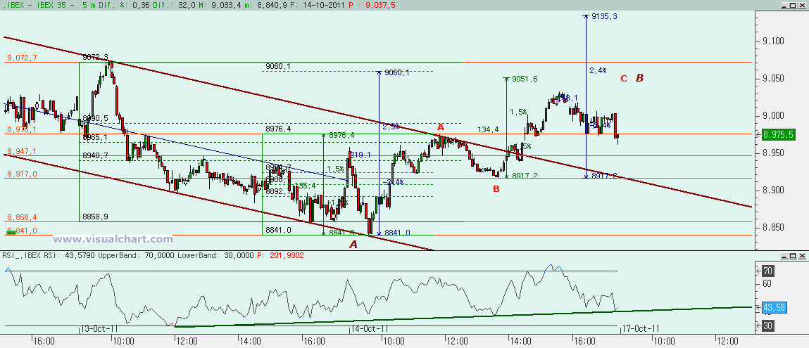 Y es que si hacemos un zoom desde máximos del jueves, podría ser que lo que hubiéramos hecho en la caída hasta mínimos del viernes fuera solo una bandera y al superar el viernes la parte alta de ese canal bajista debamos volver a subir. O puede ser que esa caída fuera solo la primera parte. Podría haber sido una A y el rebote posterior la B. Si ese rebote posterior se hace en ABC y la C es igual a la A, el objetivo debería ser los 9.052 para luego hacer otro tramo bajista que fuera la C y que si fuera igual a la A deberían ser 230 puntos. Pero si superamos esos 9.052 y, sobre todo, los máximos del jueves, entonces el objetivo debería estar en los 9.135 para hacer un tramo igual al 162% de esa posible A del gráfico. Y luego veríamos si estamos haciendo 5 alcistas o bien una ABC irregular. Y eso lo veríamos si perdiéramos los 8.976 o no.
