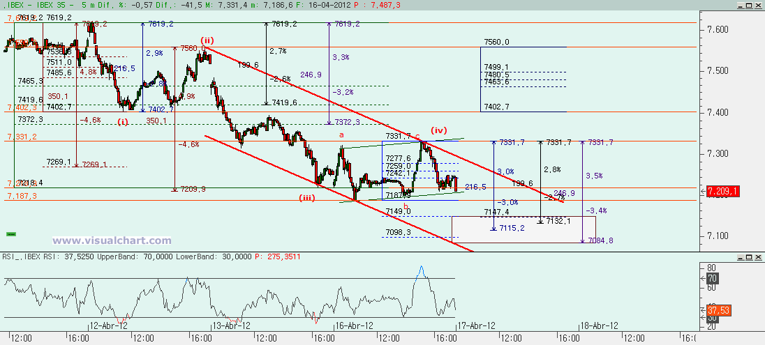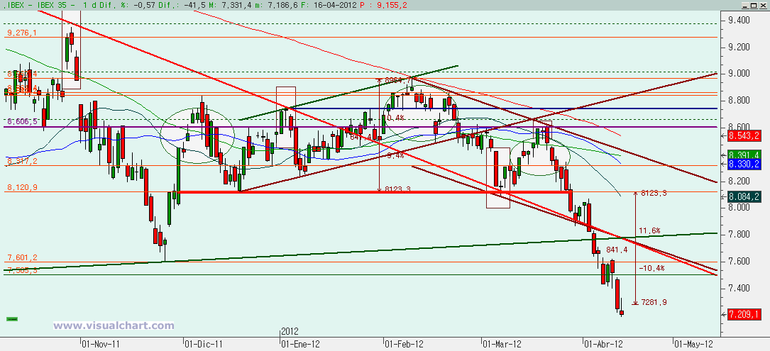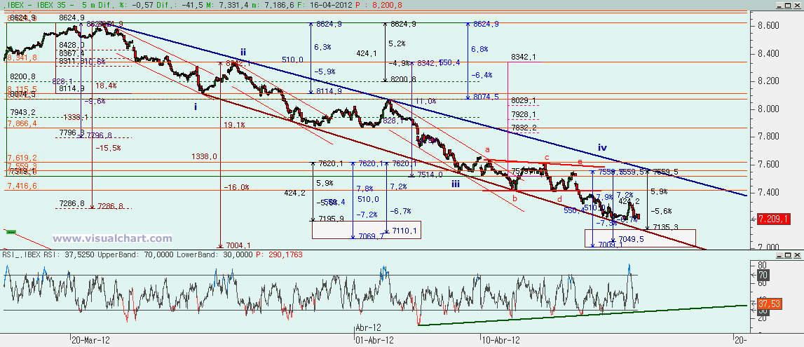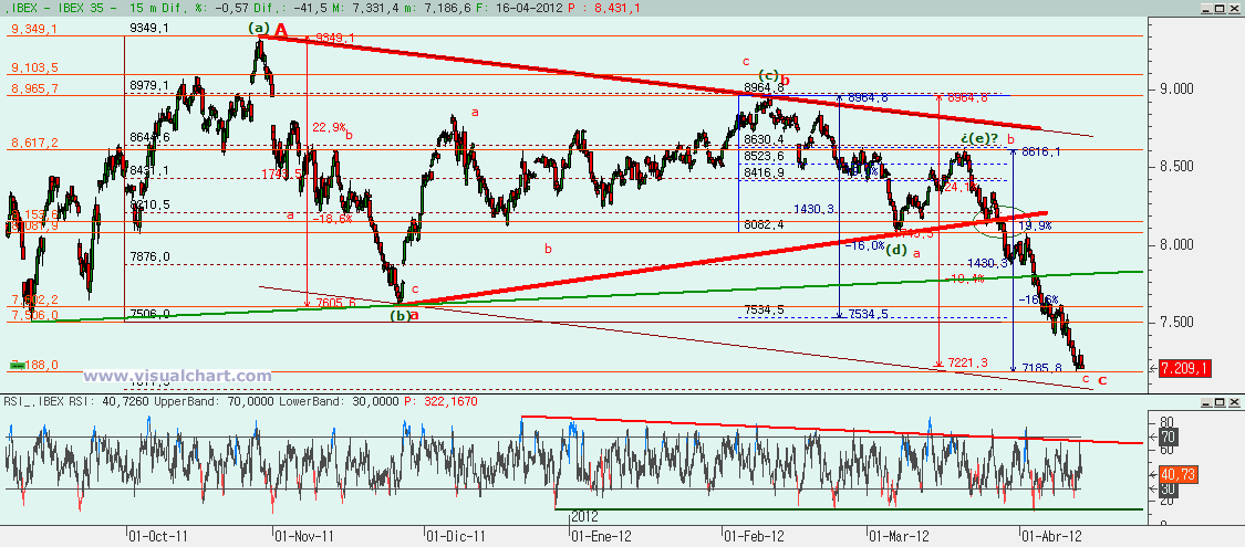 Lunes 16 de Abril de 2012: Nueva jornada bajista en el Ibex para comenzar la semana aunque suavizando la caída y dándonos un respiro, aunque habrá que ver si es la calma que precede a una nueva tempestad o no. De momento hoy hemos hecho un nuevo mínimo con respecto al de ayer y lo más interesante de todo es que el mínimo de hoy coincide casi exactamente con el que marcamos ayer para un posible escenario no tan catastrófico, aquél que nos dice que esta caída sería solo una B desde mínimos de septiembre, una B fuerte, y que quedaría una C alcista que podría incluso irse por encima del máximo de octubre. Podría ser la duda que nos pusieran encima de la mesa para volver a confundirnos y hacernos perder el dinero. Pero veamos los gráficos y las posibilidades.