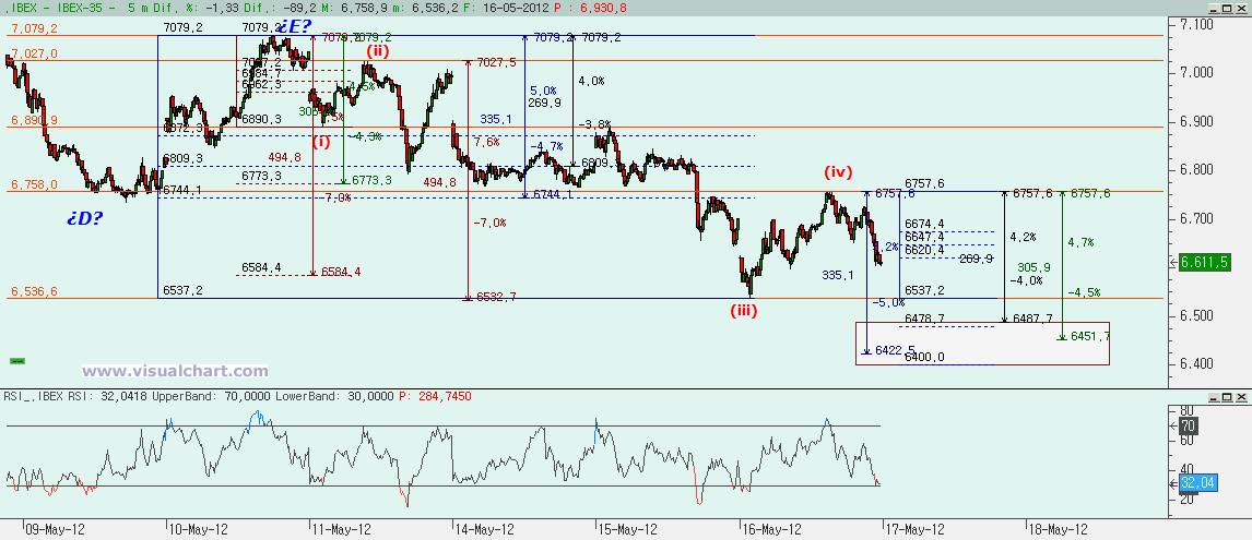 Miércoles 16 de Mayo de 2012: Nueva sesión bajista en el Ibex que cierra ya por debajo del soporte del 6.700 pero sin llegar a desplomarnos, lo que parece indicarnos que estamos en esa v que nos faltaba y que, aunque hayamos perdido el soporte, podríamos no tener que bajar tanto antes de un rebote. Vayamos con los gráficos.