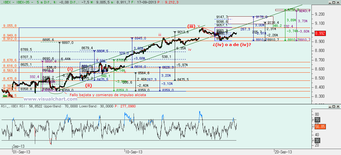Gráfico desde mínimos de finales de agosto: tenemos el recuento de 5 alcistas también en marcha y la duda sigue siendo si en el mínimo de hoy hemos hecho una (iv) completa o si solo es una parte, una a. Si hubiera acabado la (iv), entonces el primer objetivo para la v estaría entre el 9.096 y el 9.178 y el segundo entre el 9.243 y el 9.256. Si solo hubiera sido la a de la (iv), entonces ahora tendríamos que estar varios días en una b y luego una c abajo. Y eso serían varios días, como decimos. Hay que ver si volvemos a máximos o no para confirmarlo. Si no lo hacemos y estamos varios días laterales, pues seguiremos en la (iv) y habrá que ver cuándo acaba.
