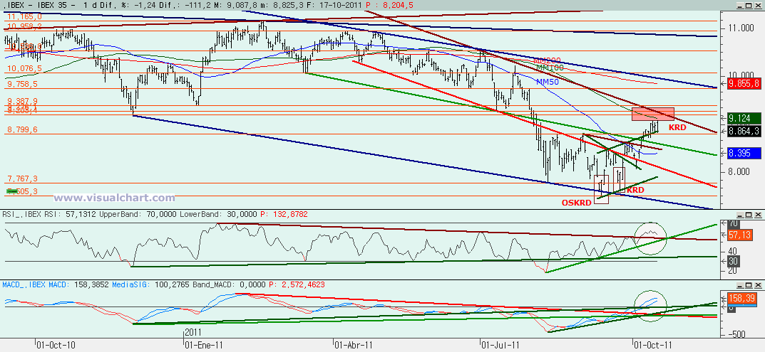 El gráfico diario nos muestra al Ibex parado justo en la zona de congestión que señalamos. Ahí está justo la MM100, la bajista, las resistencias entre los 9.200 y 9.300… El viernes dejamos una señal de KRD que podría significar un giro. Hoy hemos superado ligeramente el máximo, pero, ¿suficiente para anular la figura? Pues la cosa es que aunque se hubiera anulado la figura, lo de hoy es un nuevo RD… Por tanto, tenemos otra nueva señal de giro en zona importante. Por otra parte, el RSI parece que quiere irse abajo otra vez a buscar la alcista desde agosto, pero el MACD, aunque sigue cortado al alza parece que la pendiente se suaviza y podría cortarse a la baja en breve.