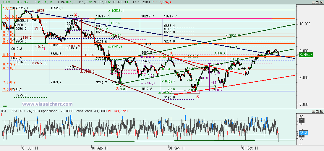 Mañana veremos si seguimos cayendo o no para ir a por los objetivos bajistas. Este último recuento parece decirnos que debemos bajar más, pero si estamos en una 4, ésta no debería superar los 8.894-8.915. Y si estuviéramos aún en la 3 entonces esos 8.726 podría ser el objetivo de esa 3 para luego buscar objetivos bajistas más abajo que nos llevaran a la proyección del murciélago o doble techo.