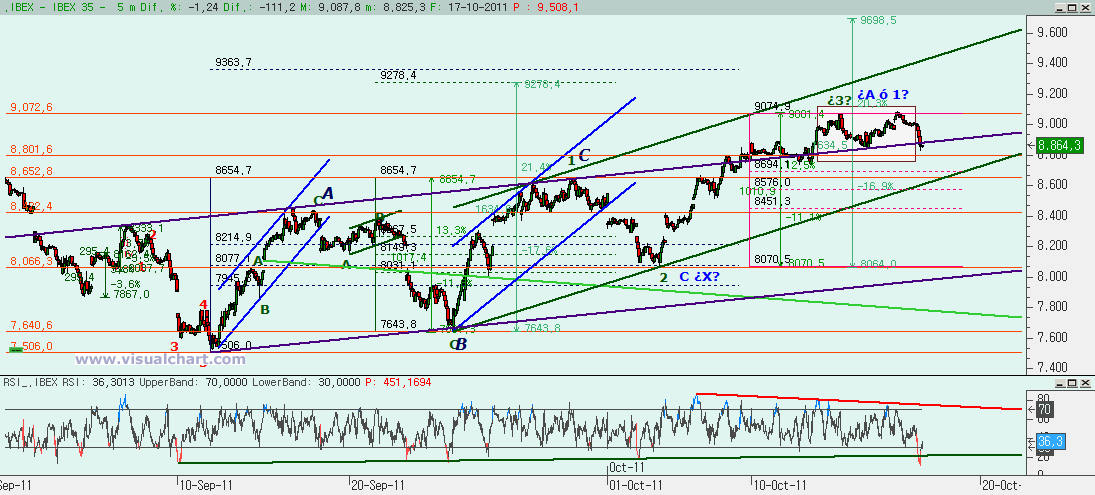 El gráfico desde mínimos de septiembre sigue siendo una incógnita. Tenemos muchas opciones abiertas pero parece que la más apropiada es la de estar haciendo una corrección compleja. Pero lo más interesante es lo que hemos marcado en el rectángulo. Tenemos lo que podría ser un murciélago, lo que nos diría que debemos bajar a cumplir la proyección bajista de ese murciélago para luego cubrirlo por arriba. El murciélago podría corresponderse con la opción de una 4, pero ya lo veremos. Eso sí, si caemos por debajo del 8.654 ya se anularía la opción de esa 4. Por otra parte, también vemos que el cierre está justo en la parte alta del canal alcista rota días atrás. Ahora se trata de ver si volvemos dentro (y habría que vigilar el canal alcista acelerado) o subimos de nuevo desde aquí en lo que sería un pull-back.