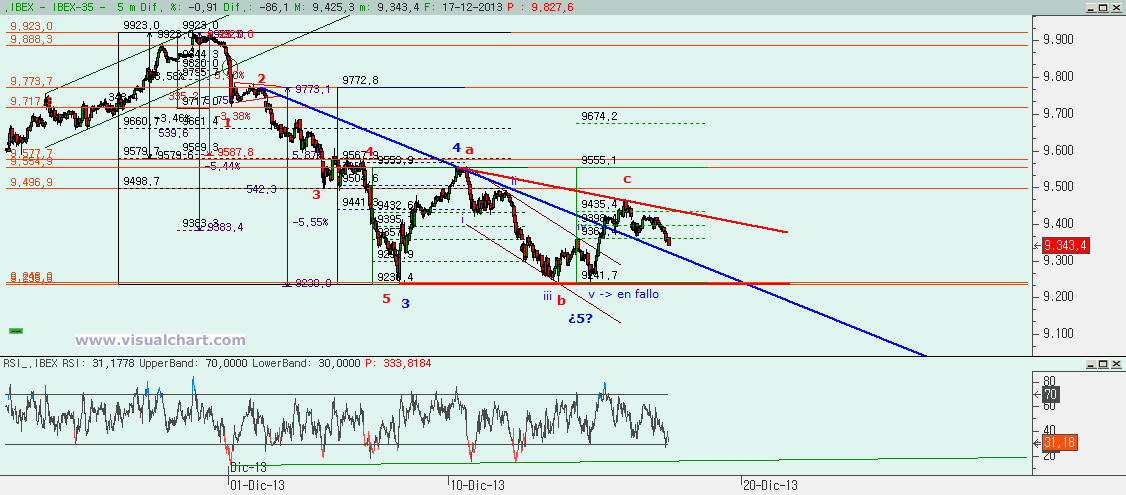 Gráfico desde mínimos del viernes: tras la subida inicial parece que estamos corrigiendo. Si así fuera, hemos trazado un posible canal bajista en el que si la corrección está siendo en ABC hay que ir al 9.326 para una C igual a la A y encima llegar al 61,8% de la subida. Si así fuera, la rotura de la parte alta de ese canal que es la 0-B sería la señal de finalización de la caída y la superación de máximos la señal de nuevo tramo alcista. Pero si el canal no funciona y la C es igual al 162% de la A, entonces objetivo en el 9.264 y eso casi sería la parte baja del triángulo, con lo que estaríamos en disposición de pensar luego en una E y la rotura por abajo. Es evidente que si llegamos al 9.264 no ha habido fallo bajista y no hemos empezado una 5 arriba. Y si no solo no bajamos al 9.264 sino que rompemos por abajo y fuerte, entonces tendríamos ese fallo de C en la plana y la caída debería ser muy severa. Pero si en el 9.326 se para esto y volvemos a subir, ojo que podemos ir bastante arriba aún.