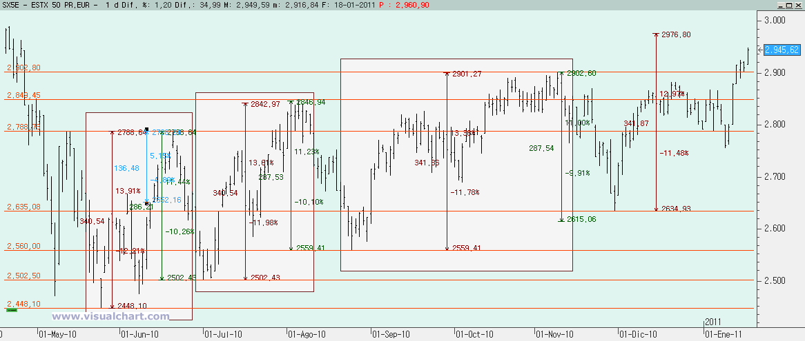 En primer lugar, volvemos a mostrar el gráfico de Euro Stoxx que señalamos en nuestro análisis del domingo (ver análisis Euro Stoxx), seguimos viendo una simetría en las subidas del índice que nos indicaría que en la zona de los 2.976 deberíamos ver un giro. Veremos si es así (queda poco más de un 1% para esa cota) y si tenemos una caída de los 287 puntos que hemos tenido en ocasiones anteriores. Es decir, que podríamos caer algo menos de un 10% en la corrección (si es que el escenario bajista no es el correcto). Pero ojo no sea que en este caso la simetría no se cumpla y nos vayamos al escenario alcista sin paradas… También ojo porque al igual que la última caída se quedó 20 puntos por encima de lo previsto (en lugar de 287 puntos de caída tuvimos 267), no vaya a ser que ahora también nos quedemos en la subida 20 puntos por arriba o por abajo… De cualquier modo, tenemos una zona de posible giro para intentar unos cortos. Por si no giramos, entonces pondremos un stop ligeramente por encima y si salta el stop, tal vez la mejor opción sería irnos con el tren alcista.