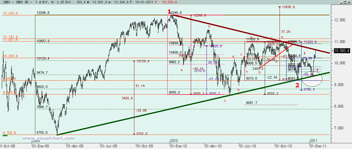 Martes 18 de Enero de 2011: Hoy han vuelto las subidas de importancia en el Ibex. Parece que nuestro índice quiere recuperar todo lo perdido con respecto al resto de índices y sube sin parar a toda velocidad para alcanzarlo. Y lo mejor de todo es que está llegando a los niveles críticos para poder descubrir si el escenario correcto a largo plazo es el alcista o el bajista. Veamos de nuevo los escenarios y cómo intentar ver si el correcto es uno u otro.