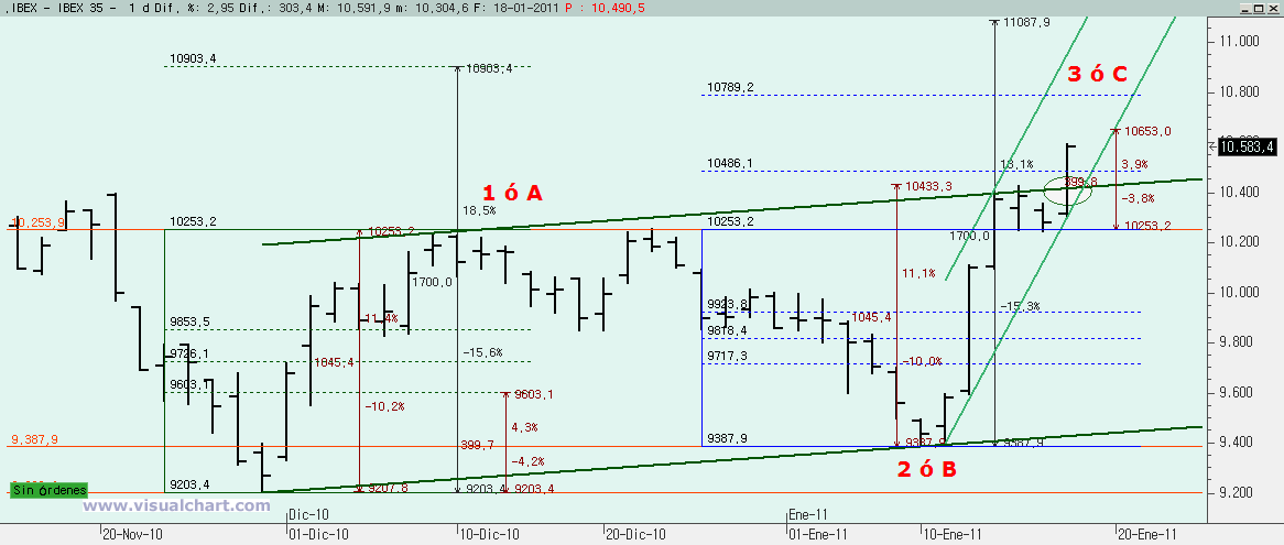 Si miramos el gráfico desde los mínimos de Diciembre de 2010, nos damos cuenta de que si el primer rebote hubiera sido una 1 o una A, la corrección siguiente la 2 ó la B, el rebote actual debería ser o una 3 o una C. Y vimos cómo paramos en la zona donde se hacía la C ó 3 igual a la A ó 1. Pero hoy hemos roto esa zona y hay que pensar en objetivos más alcistas. Además hemos roto el canal alcista marcado en verde oscuro hoy, lo que invita a pensar en que el canal alcista se ha acelerado y el correcto ahora es el verde claro. En primer lugar marcamos los 10.653, porque es la cota en la que se alcanza el 38,2% de la posible A ó 1 desde sus máximos. Pero después ya habría que pensar en los 10.789 como retroceso del 162% de la posible B ó 2. Y más arriba los 11.087 como cota que haría la C ó 3 igual al 162% de la A ó 1.