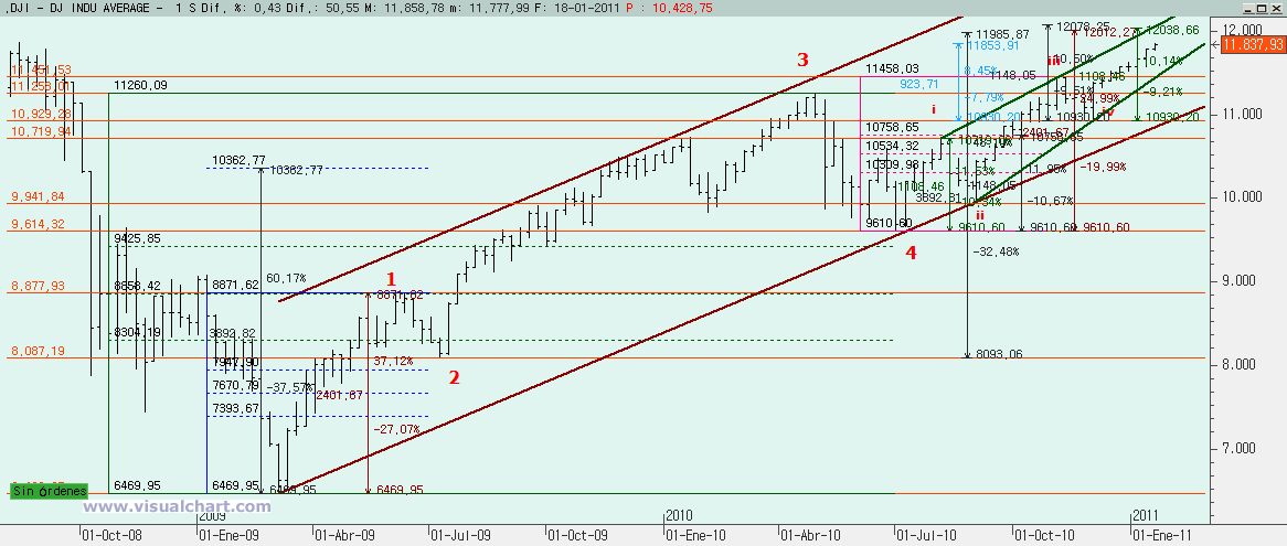 Si ahora le echamos un vistazo al Dow Jones, tal vez el recuento nos señala que estamos en una 5 alcista desde mínimos de Marzo de 2009, concretamente en la v de esta 5 alcista. El canal alcista es claro y parece que también tenemos una cuña ascendente dentro de la posible 5, lo que nos indicaría una pauta de finalización del impulso alcista. Si así fuera, en breve deberíamos ver una corrección. Y si es una corrección a 5 ondas alcistas, al menos deberíamos ver que corregimos hasta el 38,2% de la subida, es decir, a la zona de los 10.000 seguramente, aunque tal vez fuéramos más abajo, concretamente a buscar la zona de la 4 de este impulso alcista, es decir, hasta los 9.600. ¿Y cuál sería el objetivo para esta 5? Pues tal y como vamos, podría ser que el objetivo alcista estaría entre los 11.985 y los 12.078, donde tenemos varias cotas importantes. Pero como hemos dicho siempre, para asegurarnos, cuando lleguemos a esta zona (incluso podríamos haber llegado ya, porque en los 11.853 tenemos otra cota posible) debemos esperar una señal de giro en el gráfico diario. Y si la tenemos, entonces habrá que pensar en que esa corrección ha llegado.