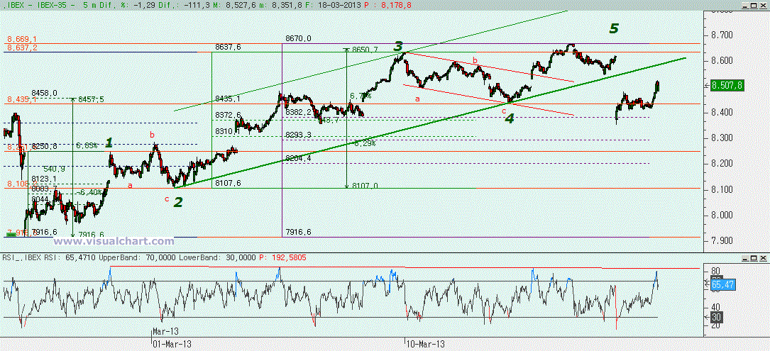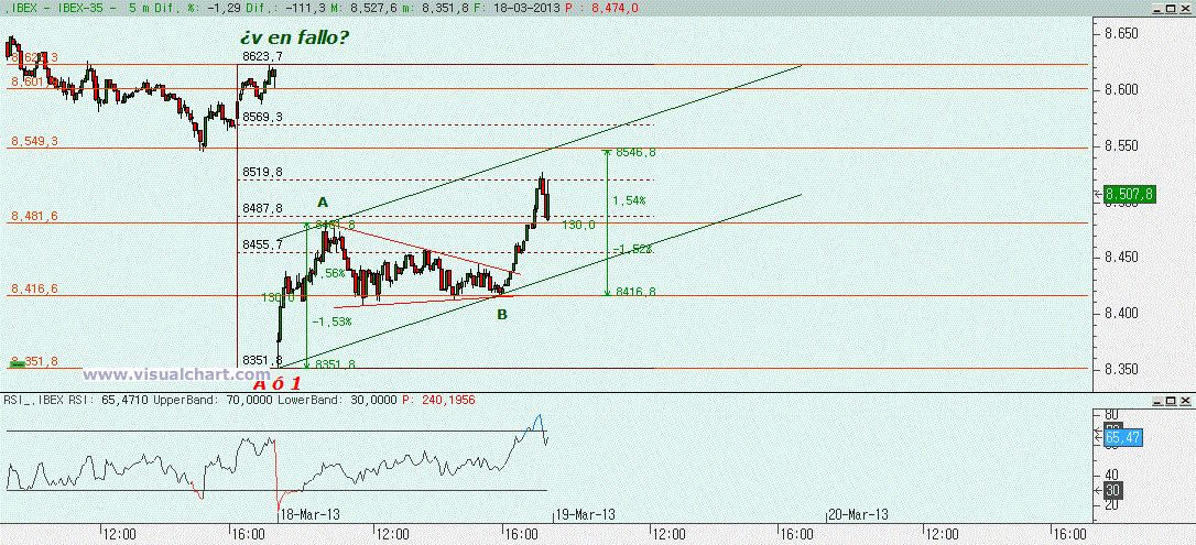 Haciendo un zoom desde el posible final de la 5, que, como hemos dicho, pudo haberse hecho en fallo, aunque alguno pensará que no, podríamos haber hecho en el mínimo de hoy una A ó 1 y el rebote posterior ser una B ó 2. Ese rebote podría habernos dejado de inicio una A, luego una B en triángulo y el rebote posterior debería ser una C, pero para que la C fuera igual a la A nos debería haber llegado hasta el 8.546. El máximo de hoy se ha quedado aún a unos puntos, pero en la zona del 61,8% de la caída. Para ver si este rebote es una B o una 2 debemos esperar a ver hasta dónde llega el rebote. Si se trata de una 2 no deberemos llegar al 80% de la caída, es decir, al 8.569. Si nos quedamos por esta zona entre el 8.519 y el 8.569 y luego perdemos con fuerza el mínimo de hoy, entonces es muy probable que este rebote haya sido una 2 y después vayamos a hacer una 3. Evidentemente, la señal de que ha terminado el ABC alcista estará si se rompe la 0-B (parte baja del canal alcista que hemos señalado) en menos tiempo del que tardó la C en formarse. Si perdemos esa 0-B pero en más tiempo, es probable que esta ABC haya sido solo una A, luego haya que hacer una B bajista y luego una C alcista antes de volver a caer. Y también está claro que si superamos ese 8.569 pero no el máximo del final de sesión del viernes, y luego rompemos la 0-B es que esta subida ha sido una B y queda una C bajista. Y si superamos el máximo del final de sesión del viernes, pues…. Entonces querrá decir que no hemos acabado la 5 en fallo y habrá que pensar en un nuevo escenario.